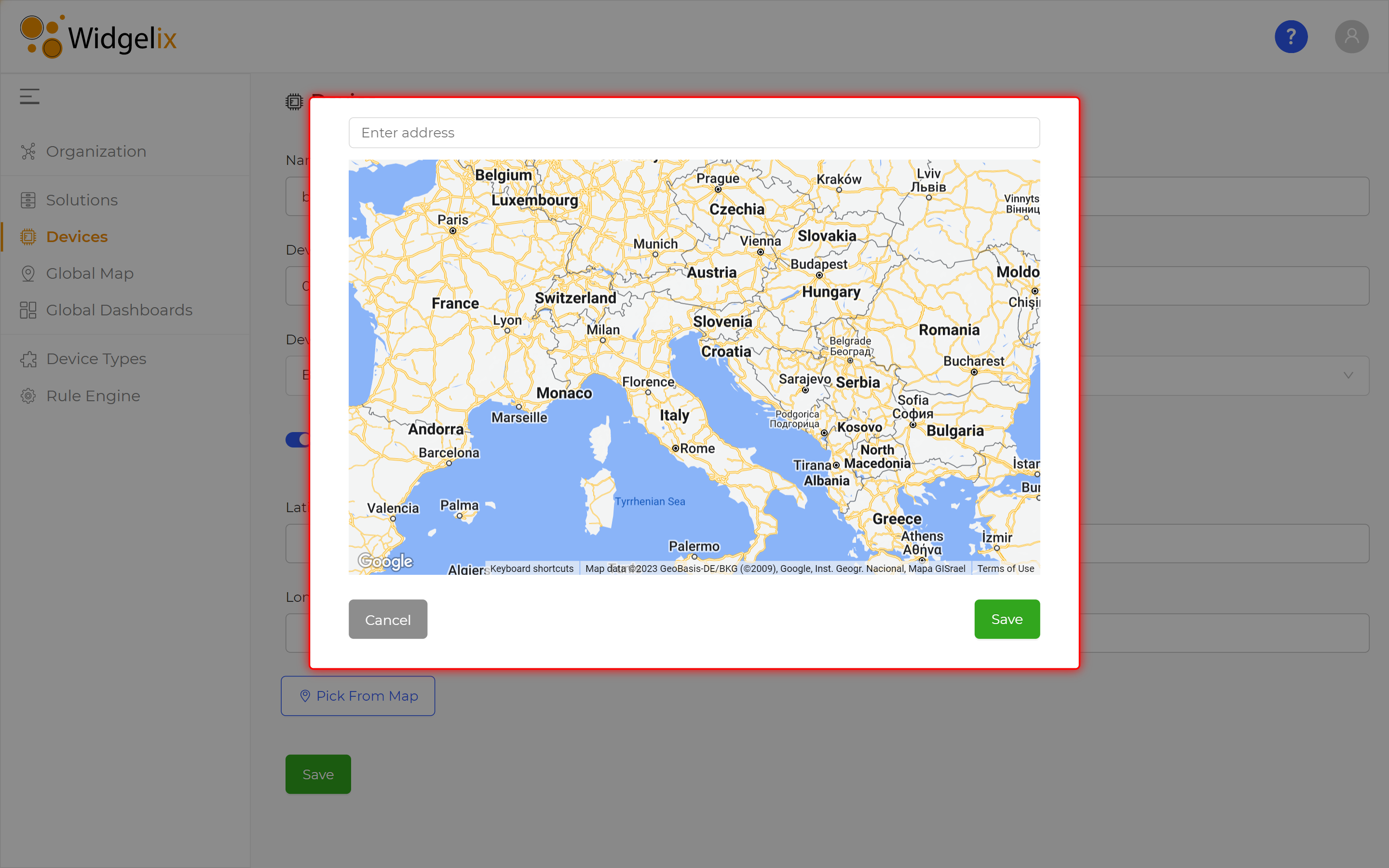 If the location is correct click on the **Save** button to add the coordinates to the device form and close the map modal box.