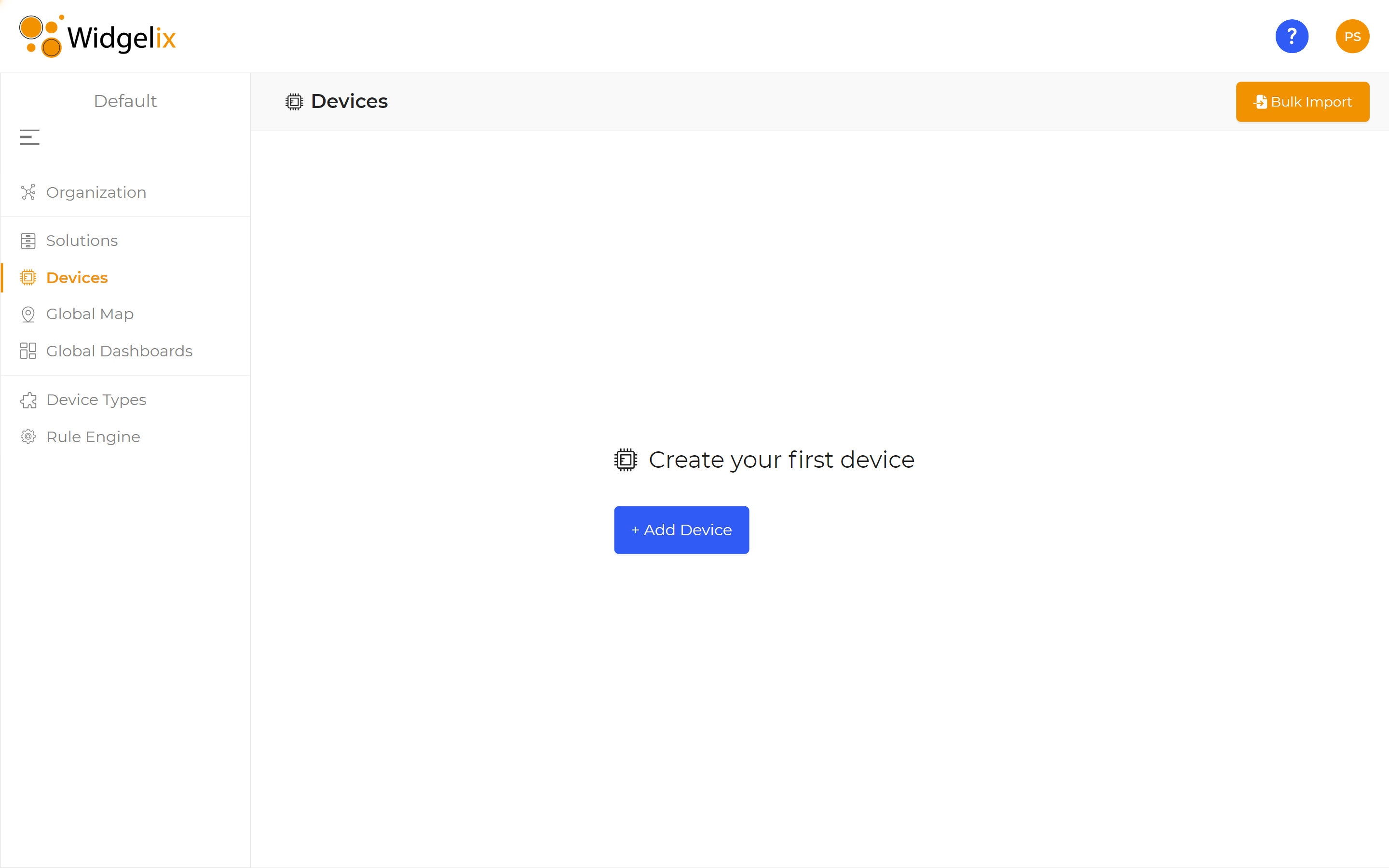 Within the Widgelix IoT cloud platform, you can either individually add new devices using the **Add Device** option or import them in bulk through the **Bulk Import** option.