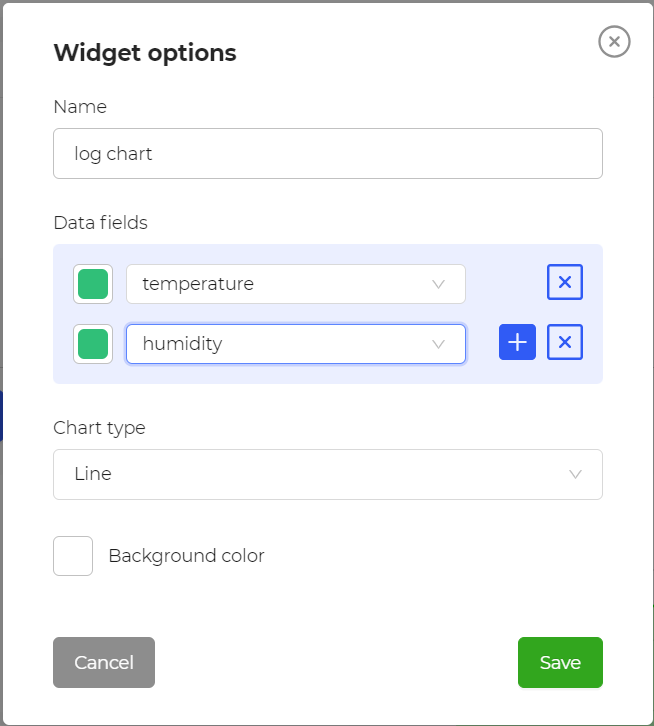 The **Log Chart** widget allows you to display one or more data fields on a line or bar chart, and it enables you to download the historical data as a **CSV** file.