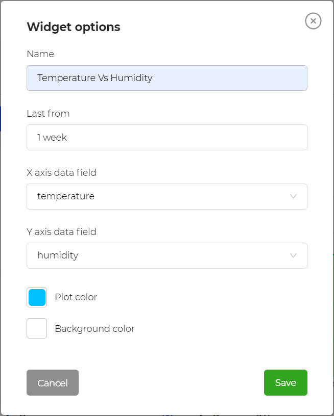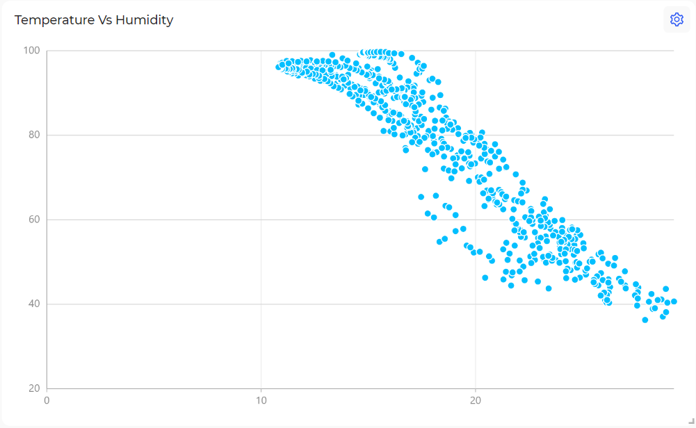 The **scatter plot** widget displays the relationship between two numerical data fields, which is useful for identifying patterns, trends, and correlations between variables. Each data point is represented by a dot or marker on the graph. The horizontal axis typically represents the independent variable, while the vertical axis represents the dependent variable.
